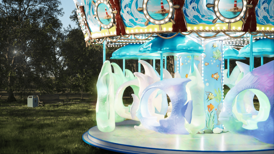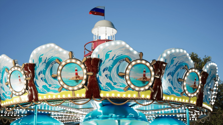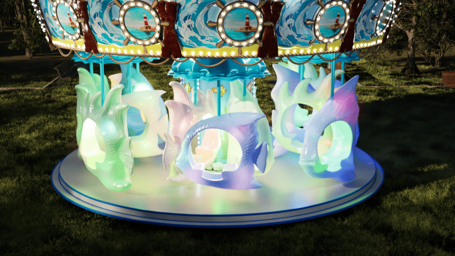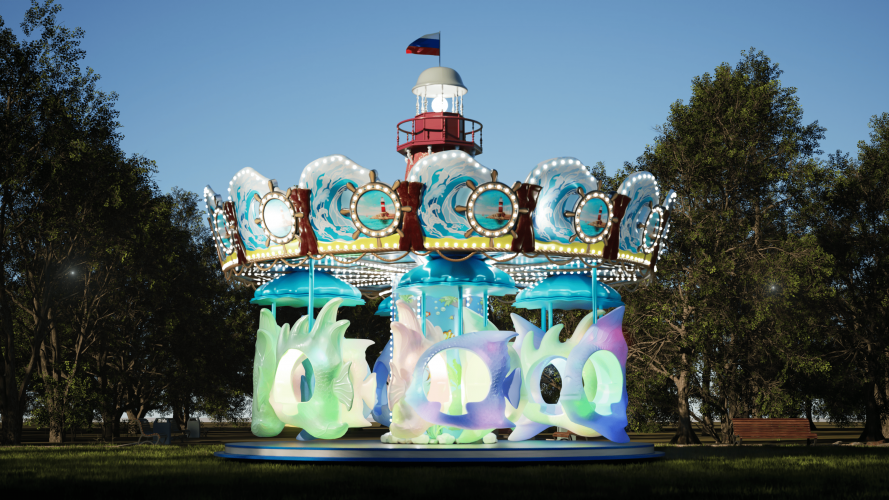 Аттракцион с круговым движением со скоростью 3-4 об. Мин. Во время работы по 3 модуля вращаются внутри по окружности и плавно поднимаются вверх и опускаются вниз.