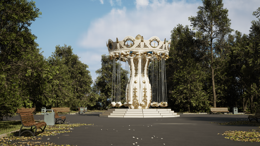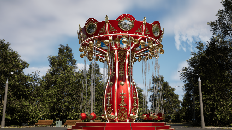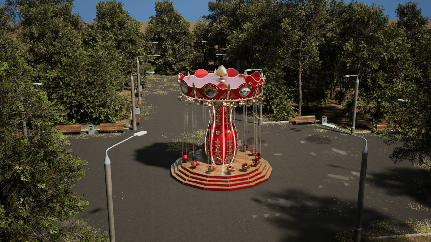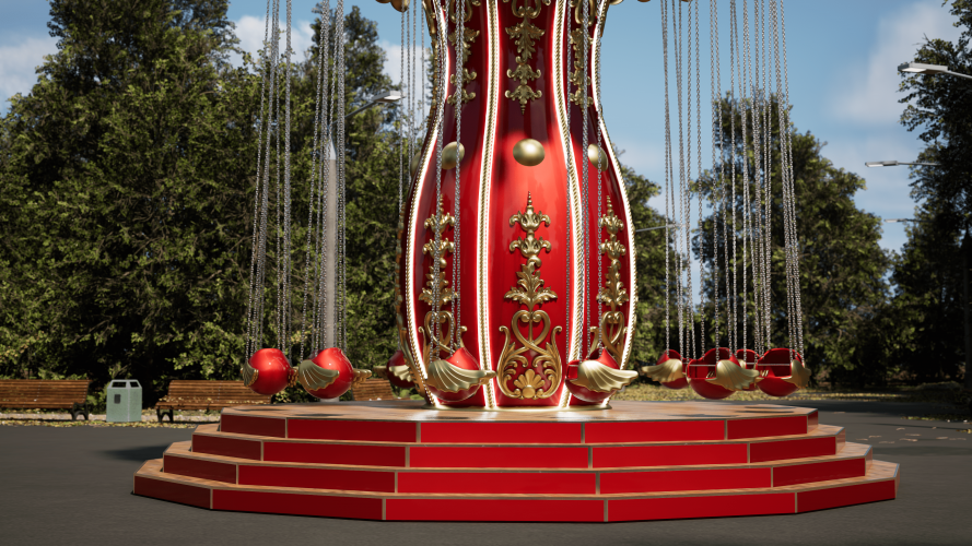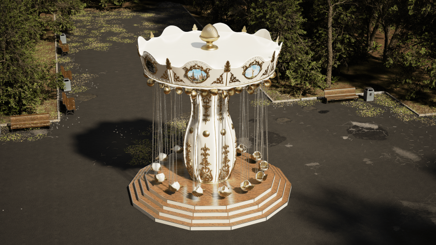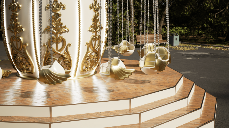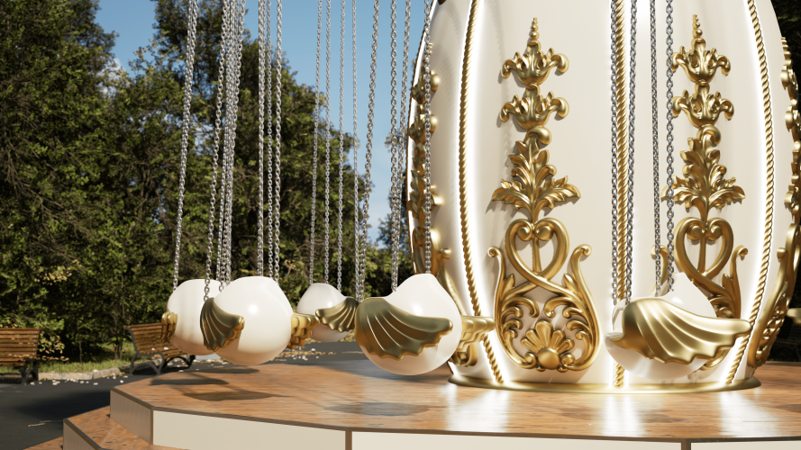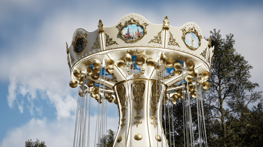 Вращение осуществляется за счет привода, мотор-редуктора, шкивов, вокруг центральной оси со скоростью 13-14 об/мин. с плавным пуском и остановкой. При вращении карусели посадочные модули вращаются вокруг оси подвеса, за счет вертлюгов и набегающего потока воздуха. Декоративное оформление, цвет, картинки на фризах и потолке по согласованию с заказчиком.